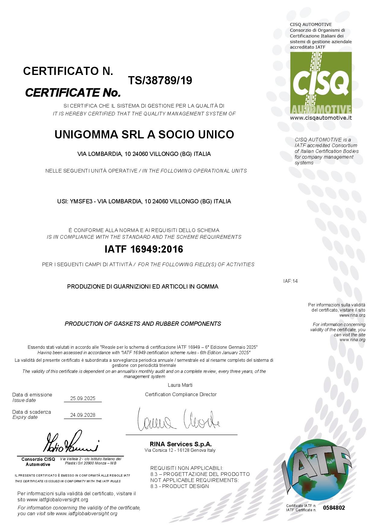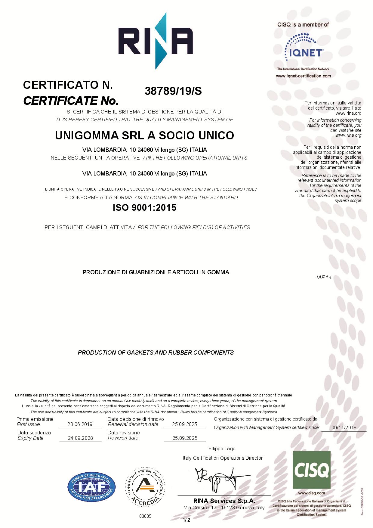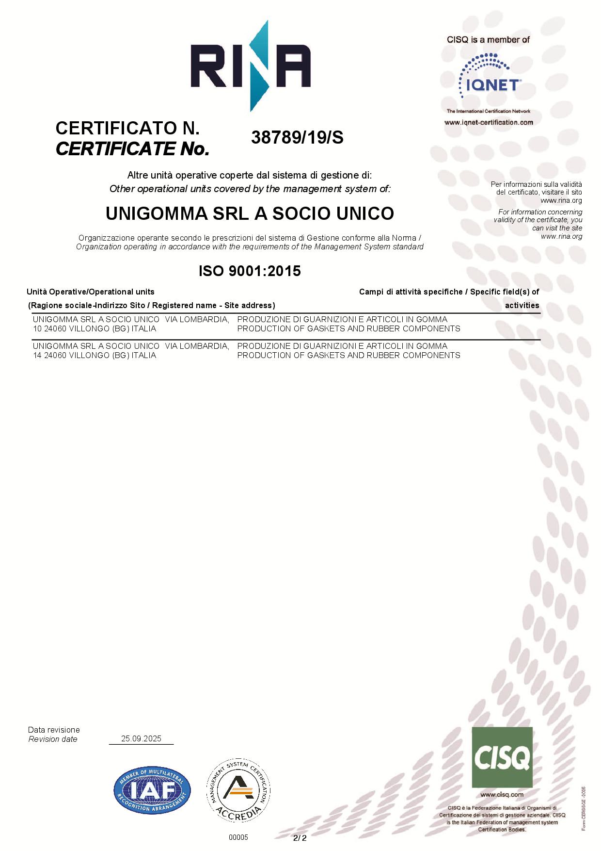Unigomma possiede un sistema di qualità certificato ISO 9001:2015 ISO 14001:2015 e IATF 16949:2016 e si avvale di strumenti di misurazione di ultima generazione. Le verifiche di conformità sono effettuate secondo le tabelle AQL, griglie di controllo secondo specifiche FMEA monitorano il processo produttivo e controlli SPC verificano lo stampaggio degli articoli. Vengono effettuati controlli di durezza IRHD Shore A e del compression set in fase di produzione e finale. Per il controllo dimensionale degli O-Rings sono utilizzate macchine a controllo ottico che permettono di fornire report di misura per ogni pezzo, mentre per i particolari a disegno Unigomma utilizza una macchina ottica elettronica con controllo tridimensionale, possibilità di report APC e invio d’ingrandimento fotografico del pezzo.